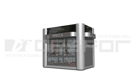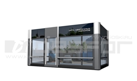 Торговый павильон модульного типа с активным остеклением и использованием поверхностей стен в качестве рекламного пространства.